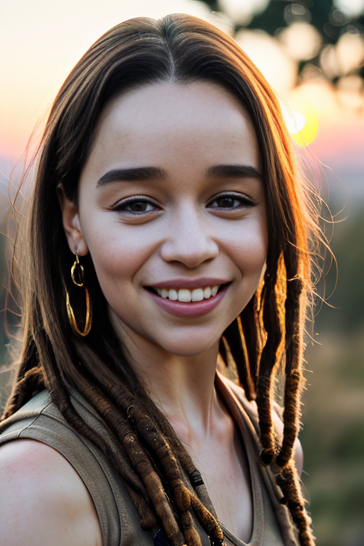 (masterpiece), (extremely intricate:1.3), (realistic), 1girl, portrait of EmiliaClarke, close-up, face focus , looking at viewer, the most beautiful in the world, smile, teeth, a woman, pilates outfit, tank top, leggings, (dreadlocks hairstyle, brown hair:1.3), sharp focus, dramatic, award winning, cinematic lighting, octane render unreal engine, volumetrics dtx, (film grain, blurry background, blurry foreground, bokeh, depth of field, sunset, motion blur:1.3), chainmail, <lora:celebrityown_EmiliaClarke:0.6>,