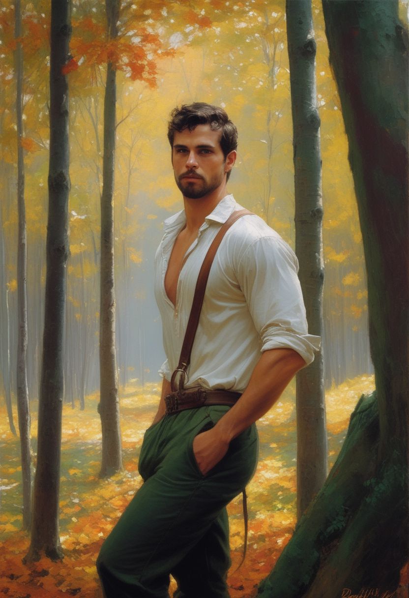 extremely detailed masterpiece by (Daniel F Gerhartz|Sam Guay|Guillaume Seignac]. romantic full body portrait. a 28-year-old Argentine hunter leans on a mahogany tree in autumn, patiently waiting for his lover. He wears a green tank top; pants; and a simple, plain necklace. He is masculine, (hypermuscular:1.9], (extremely-hairy:2.2], dashing, rugged, and roguish; a dark-brown very short undercut; an unshaved, perfect, stylish, short, neatly-trimmed beard; and (dark-mahogany-toned skin:1.8]. He expresses patience, hope, longing, and romance.