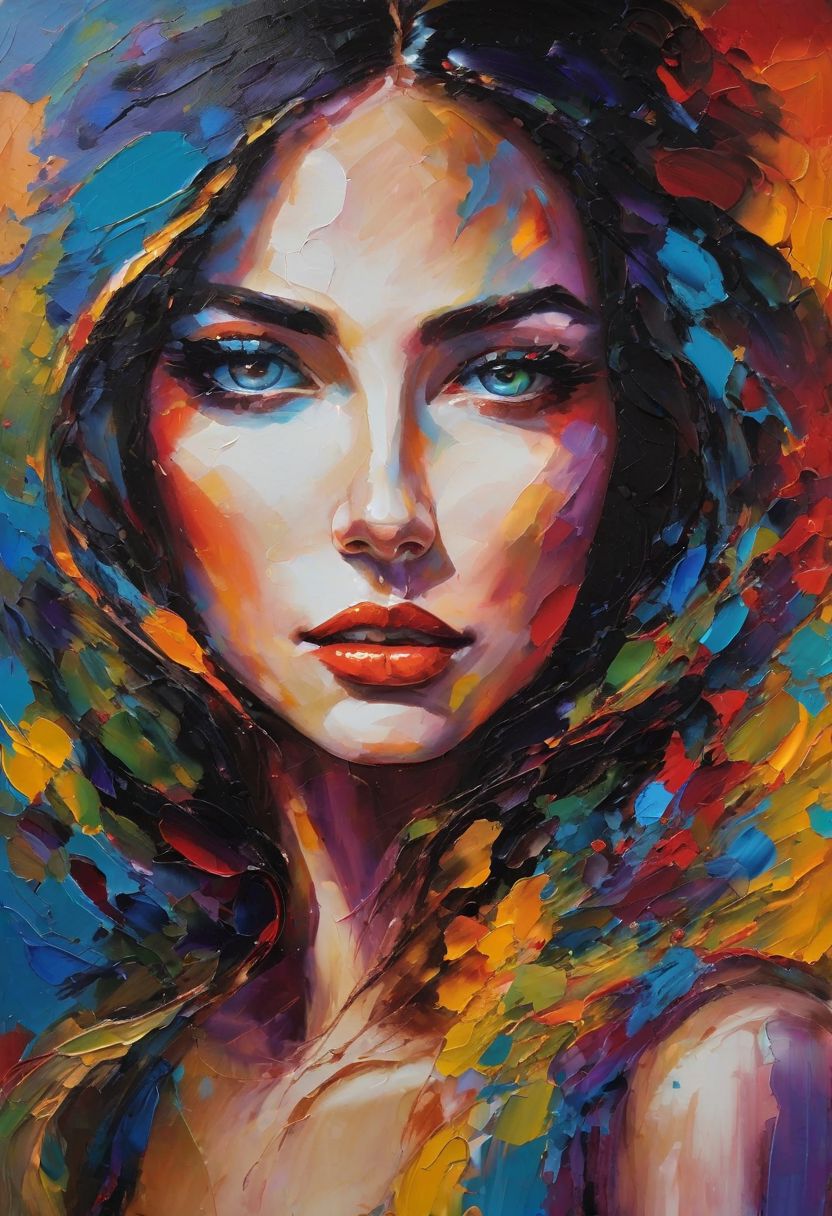 A captivating abstract portrait of a woman's visage, masterfully crafted with a mesmerizing fusion of acrylics, oil, and canvas. The artist's proficiency in impasto acrylic techniques is evident, creating an enchanting depth and dimension through bold, textured brushstrokes. The non-traditional, irregular canvas edges emphasize the piece's raw, organic character. Rich colors and shapes entwine harmoniously, forming a vibrant artistic tapestry that embodies freedom and individuality. Each deliberate brushstroke imbues the canvas with life, serving as a poignant testimony to the artist's unbounded creativity and self-expression.