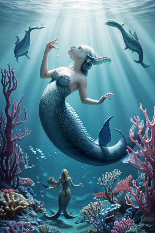 A stunning and realistic underwater scene, featuring a magnificent sea monster with intricate scales and a long gray mane. The creature is surrounded by a group of beautiful mermaids with slender fish tails, each with reflective skin and stunning features. The background is dim, with a sense of mystery and enchantment, while the foreground is illuminated by a soft, ethereal light.