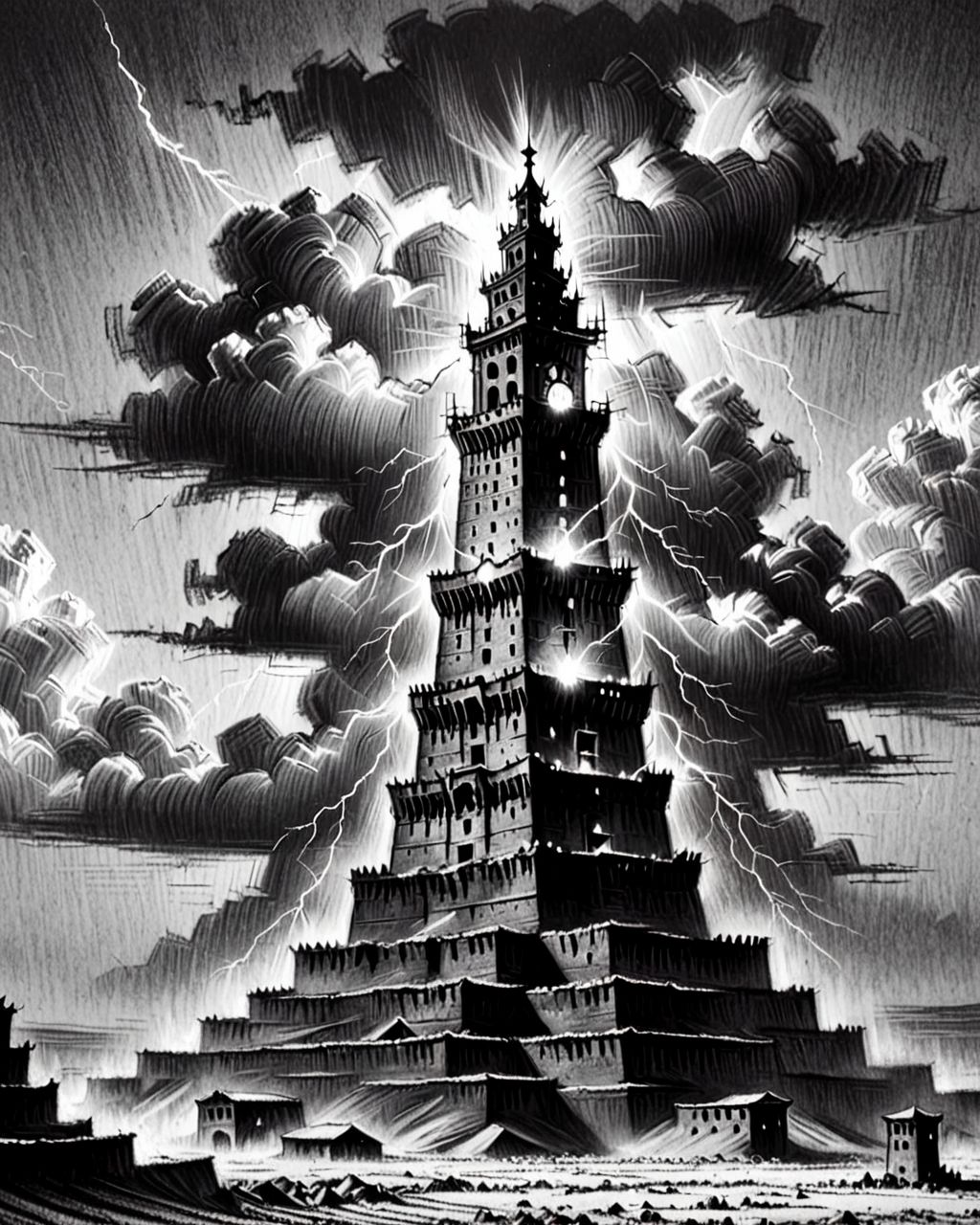 monochrome greyscale noise grainy dirty charcoal drawing of (lightning hitting the babel tower:1.3), with a dark sky, , depressing vibe, desert, sand, rocks, massive tower, huge, <lora:CharcoalDarkStyleXL:1.5> CharcoalDarkStyle, slaves working