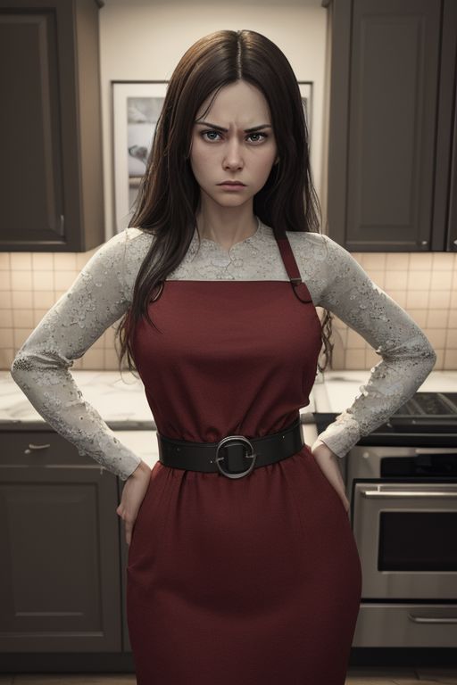 (masterpiece:1.5), (Highly detailed scenery:1.5), (perfect detail:1.5), (highly detailed:1.5), (high resolution:1.5), best quality, 8k, detailed, A wife meets her husband at home who has done something wrong, A photo of 25yo dissatisfied russian woman, got angry, frowning, angry, dissatisfied, hands on the belt, wife got angry with her husband, husband did something wrong, frowning, angry, dissatisfied, ((hands on the hips)), ((look at viewer)), kitchen, home clothes,
