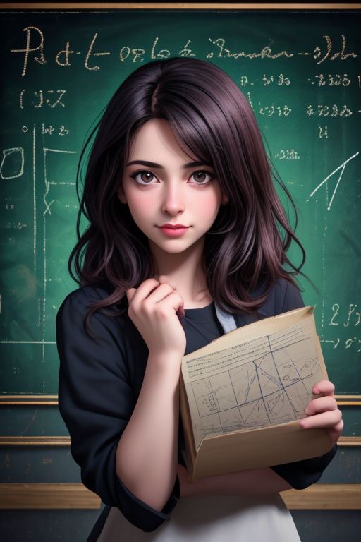 A young white Syrian-American teacher, Realistic picture, teaching near blackboard, long crawly hair, beautiful, her beaming face reflects her passion for education, blackboard behind her dominates the background, scrawled with complex mathematical equations, vivid colors, evocative, crisp lines, high resolution, vibrant hues, artistic softness"