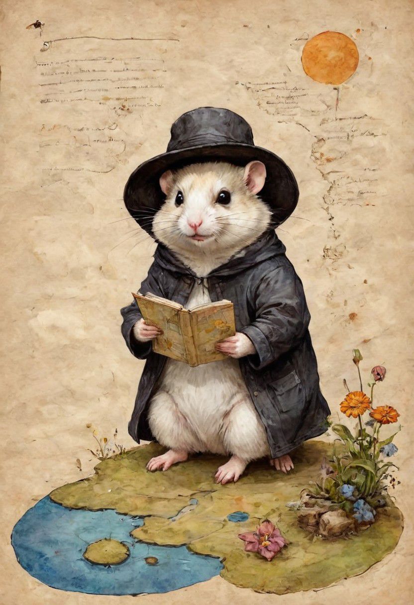 old book style ink illustration, on parchment, ink splashes, ink stains, ink smears, faded ink, chubby Dzungarian hamster in an adventurer's hat, He holds a map and pencil in his paws, Seeing plants and flowers from the ground, view from below, atmospheric dreamscape painting, dream scenery art, highly detailed visionary art, cgi style, vibrant oil painting, splash art, Cozy mystery, masterpiece 8k wallpapper, neoplasticism, Unreal Engine, dramatic lighting, coat, pantless, linquivera, liiv1, on parchment
