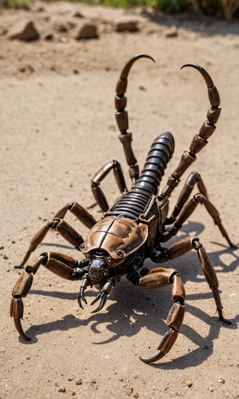 photo of a mechanical scorpion, (ground level shot, dynamic angle), best quality, photorealistic, ultra-precision, high resolution RAW photo