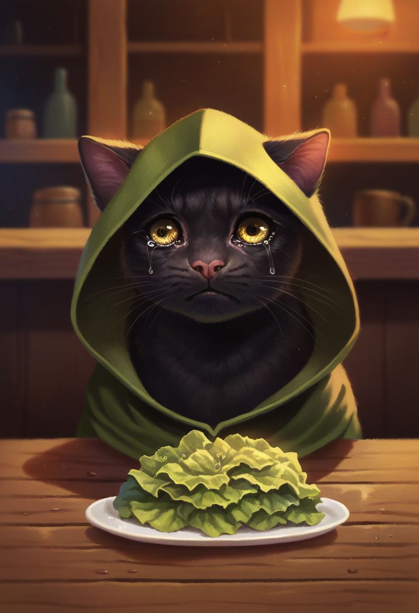 score_8_up, score_7_up, score_6_up, score_5_up, solo, cat, black fur, panther, yellow eyes, tears, detailed eyes, rogue outfit, hood, inside a tavern, empty plate, lettuce leaf, sad cat meme, pikaole, cute, bokeh
