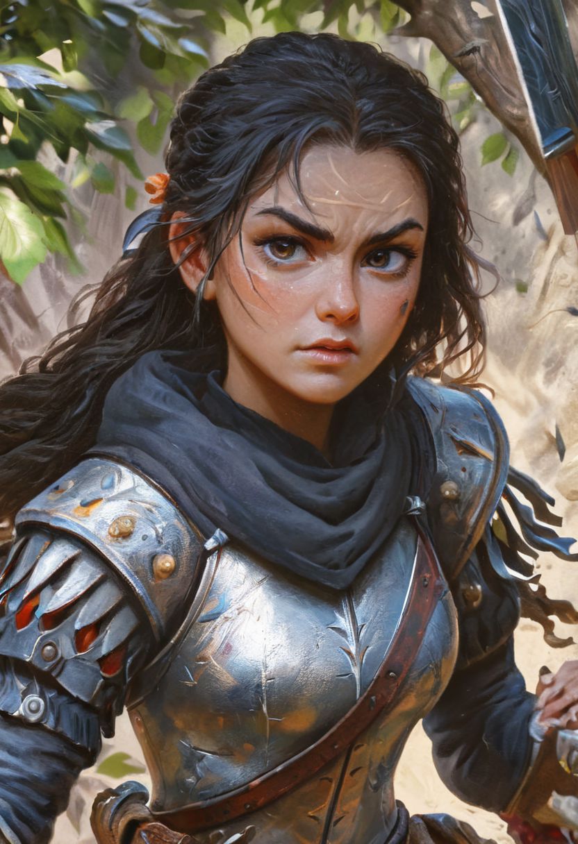 a fantasy (1girl) in action scene, extremely detailed eyes and face, outdoors, blush, throwing knives, knives, serious face, full body, ultra-detailed, ultra-fine painting, sharp focus, professional, detailed, fantasy, rpg, rpgartworkstyle, artwork, detailed