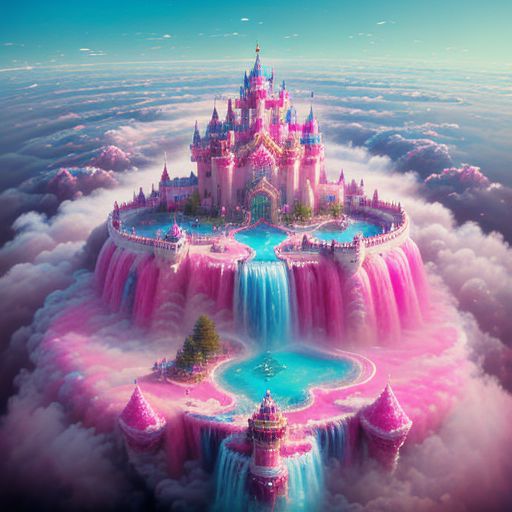 ASCIIaerial view very high altitude extreme wide shot pink cyan diamond fantasy castle on the clouds, pool waterfall