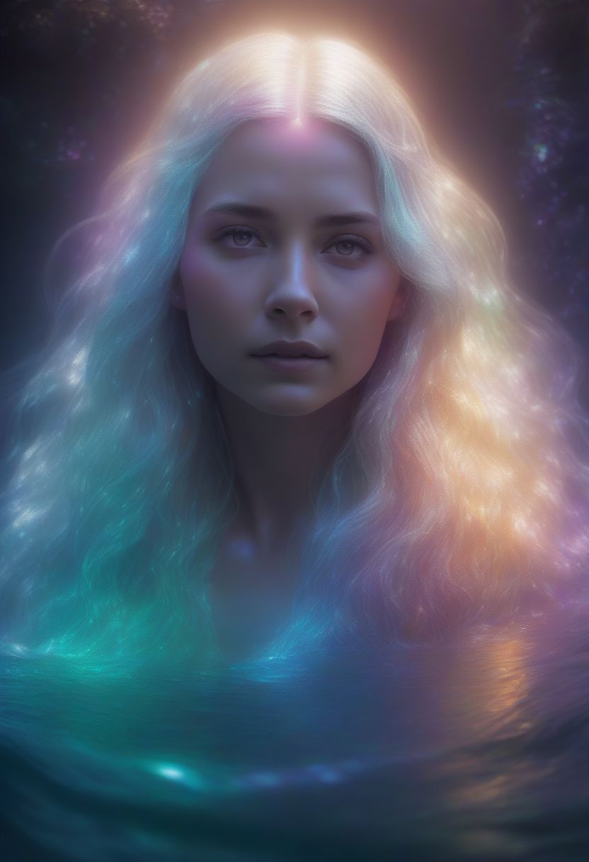 a magical woman, light art, Iridescent atmosphere, refracted light effects, rainbow colors, water soft iridescent, white long wavy hair,