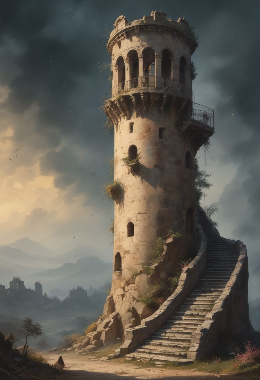 a ruined ancient tower surrounded by a spiral staircase, atmospheric,several figures, haze,and blooming almonds,photorealism, hyperdetalization, fuzzy, dispersion, flicker, 3d effect,16k, careful drawing of details, voluminous watercolor, professional photo,dark botanical, hyperdetalization, illustration,high details