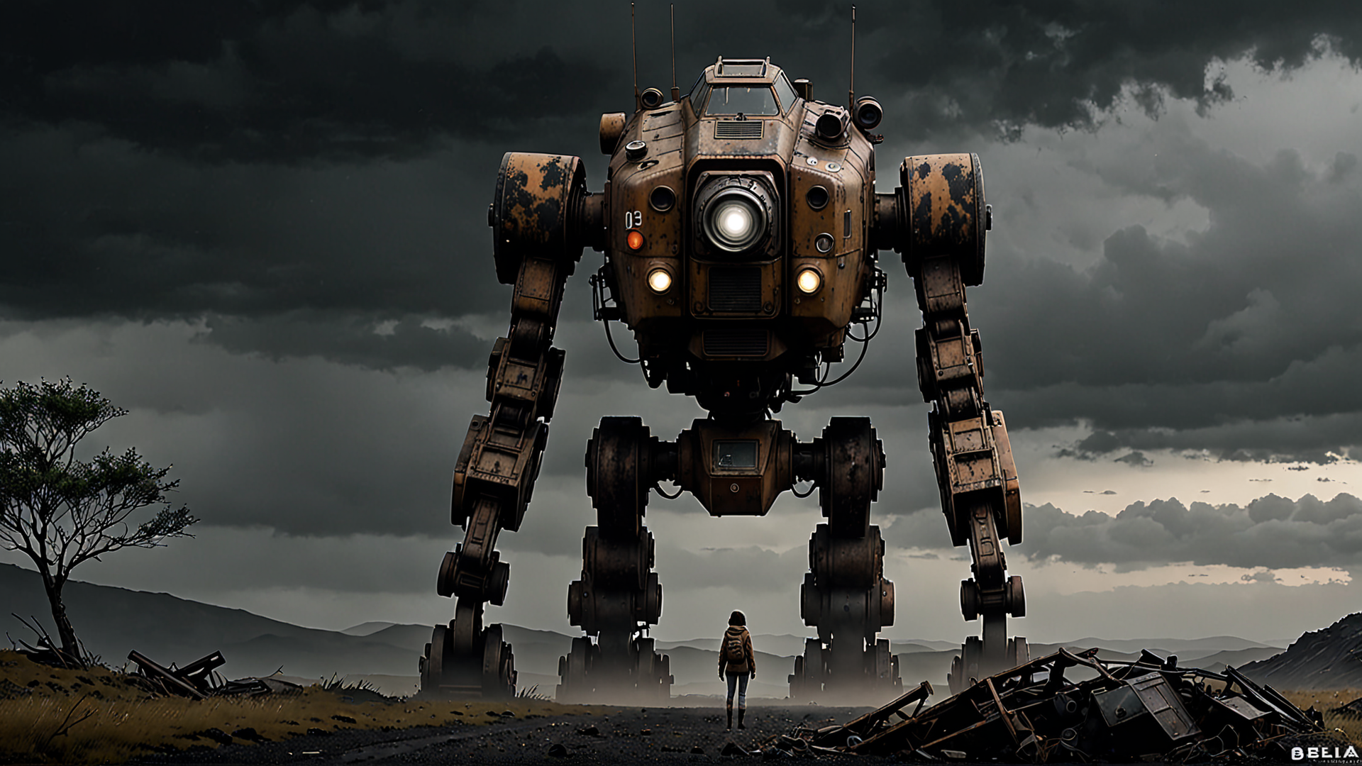 side-view, illustration, concept art, sci-fi, game art, cinematic, photography, UK, dynamic-action, Movie Director, Ghibli, grim-dark, cinematic-horror, nightmare-landscape, hellish-ambiance, rust, mold, singed, desolation, devastation, dark-sky, night, fog, post-apocalyptic, ominous, ruined mech powered-down off to the side, human bystander looking at broken mech, (blend <(style of Loish)> <(style of Bella Kotak)> <(style of Hayao Miyazaki)>), anime, very-dark, dark-ambiance, ominous-ambient, smoke, dark-clouds, night, horror, nightmare, dark-sky, 8k, uhd, high-quality-textures, reflections, octane-render, details, shadows, raytracing, masterpiece,
