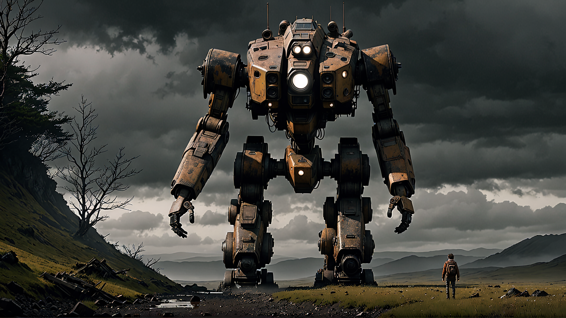side-view, illustration, concept art, sci-fi, game art, cinematic, photography, UK, dynamic-action, Movie Director, Ghibli, grim-dark, cinematic-horror, nightmare-landscape, hellish-ambiance, rust, mold, singed, desolation, devastation, dark-sky, night, fog, post-apocalyptic, ominous, ruined mech powered-down off to the side, human bystander looking at broken mech, (blend <(style of Loish)> <(style of Bella Kotak)> <(style of Hayao Miyazaki)>), anime, very-dark, dark-ambiance, ominous-ambient, smoke, dark-clouds, night, horror, nightmare, dark-sky, 8k, uhd, high-quality-textures, reflections, octane-render, details, shadows, raytracing, masterpiece,