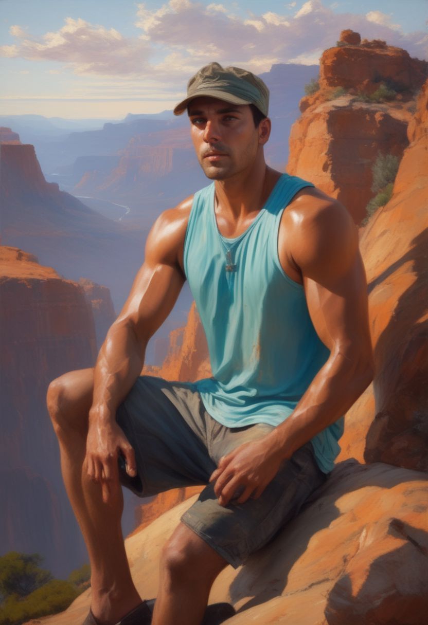 extremely detailed masterpiece by (Daniel F Gerhartz|Sam Guay|Guillaume Seignac]. romantic full body portrait. a 28-year-old Argentine huntsman leans on an enormous boulder in the desert canyon, patiently waiting for his lover. He wears a hat; shorts; boots; an aqua ((sleeveless:3) tunic:1.7]; and a plain necklace. He is masculine, (extremely muscular:2.9], (extremely-hairy:2.2], dashing, rugged, and roguish; a dark-brown very short undercut; an unshaved, perfect, stylish, short, neatly-trimmed beard; and (dark-mahogany-toned skin:2.8]. He expresses patience, hope, happiness, love, and romance.
