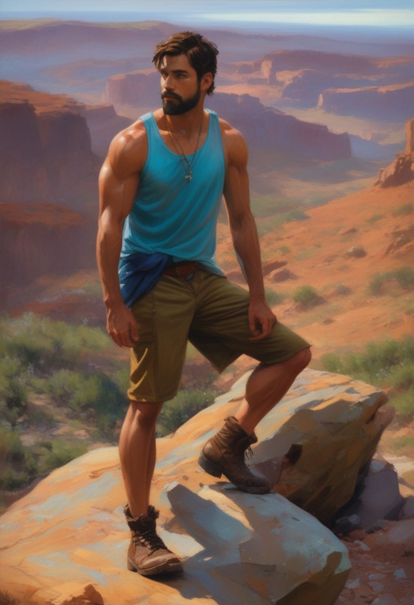 extremely detailed masterpiece by (Daniel F Gerhartz|Sam Guay|Guillaume Seignac]. romantic full body portrait. a 28-year-old Argentine huntsman leans on an enormous boulder in the desert canyon, patiently waiting for his lover. He wears shorts; boots; an aqua ((sleeveless:3) shirt:1.7]; and a plain necklace. He is masculine, (extremely muscular:2.9], (extremely-hairy:2.2], dashing, rugged, and roguish; a dark-brown very short undercut; an unshaved, perfect, stylish, short, neatly-trimmed beard; and (dark-mahogany-toned skin:2.8]. He expresses patience, hope, happiness, love, and romance.