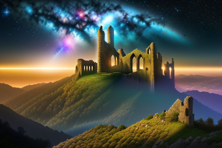 A mythical nightscape illuminated by the glow of a thousand stars, a towering castle perched atop a craggy cliff, its spires reaching towards the heavens, a mystical aura enveloping the scene, with fantastical creatures soaring through the night sky, Photography, DSLR camera with a telephoto lens (200mm), f/2.8 aperture, ISO 1600, --ar 16:9 --v 5