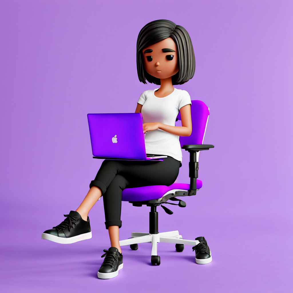 1girl, solo, black hair, shirt, purple background, computer, shoes, white shirt, chair, sitting, pants, black footwear, short sleeves, black eyes, simple background, arms up, laptop, sneakers, full body, purple pants, blue pants <lora:3dillu(1):1>