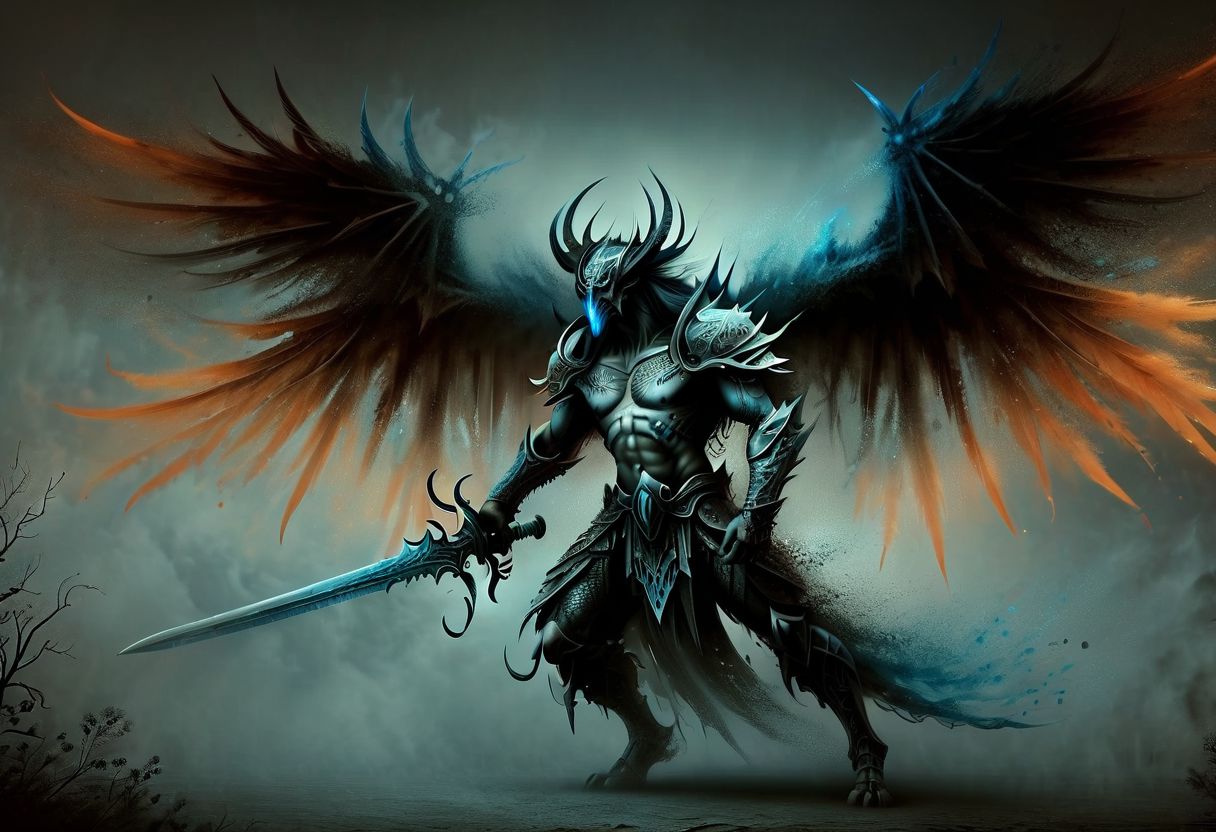 masterpiece, ASCII, intricate, maximum resolution, hyper detailed, Mirage, fog, white armor with orange and blue details, hellgate london themed, angelical, sanguinius, orc, force huge wide wings, glowing wings, energy wings, holding sword, orc king