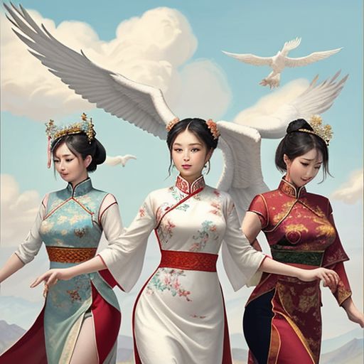 Three beauties in ancient Chinese costumes dance gracefully like the Feitian in the Dunhuang murals. The beauty is wearing a white gauze-like dress. Be like flying in the sky, surrounded by white clouds and phoenixes flying. The face is clearer and the painting style is realistic