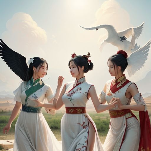 Three beauties in ancient Chinese costumes dance gracefully like the Feitian in the Dunhuang murals. The beauty is wearing a white gauze-like dress. Be like flying in the sky, surrounded by white clouds and phoenixes flying. The face is clearer and the painting style is realistic