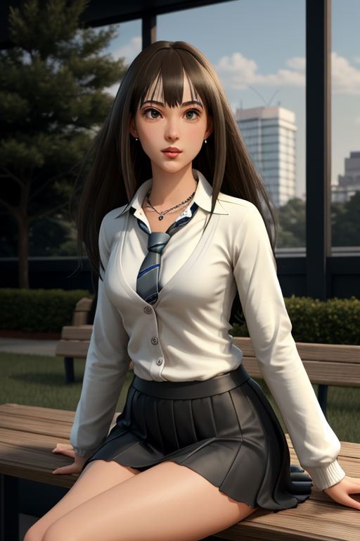 masterpiece, best quality, highres, aarin, long hair, earrings, necklace, school uniform, necktie, collared shirt, black cardigan, long sleeves, pleated skirt, grey skirt, <lora:shibuya_rin_v1:0.7>, expressionless. , 1. Generate a 3D model of Sophia Reynolds with asymmetrical features and a square-shaped face. 2. Design Sophia s eyes to be small and droopy with a dull brown color. 3. Create short, frizzy hair for Sophia in an unflattering shade of gray. 4. Sculpt Sophia s body to be overweight with disproportionate limbs and a slouched posture.distorted hands 5. Dress Sophia in outdated, mismatched clothing that does not flatter her figure. 6. Generate a series of poses for a female model exuding confidence and sensuality while showcasing lingerie, focusing on alluring body language, subtle yet captivating facial expressions, and dynamic poses that highlight the lingerie s features and accentuate the model s curves.sitting, bench, park, outdoors, crossed legs,