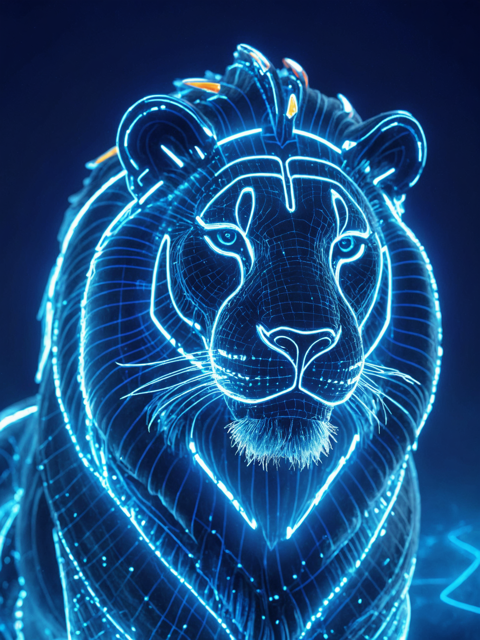 visual data, technical style, blue and white color scheme, Close-up of a lion, glowing lines, 3D rendering, OC renderer, 8K,HD