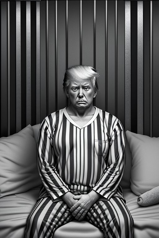 hyper-realistic, fine detail, sad Donald Trump sitting in a jail cell wearing black and white striped prison clothing. He is crying sitting on his prison bed.