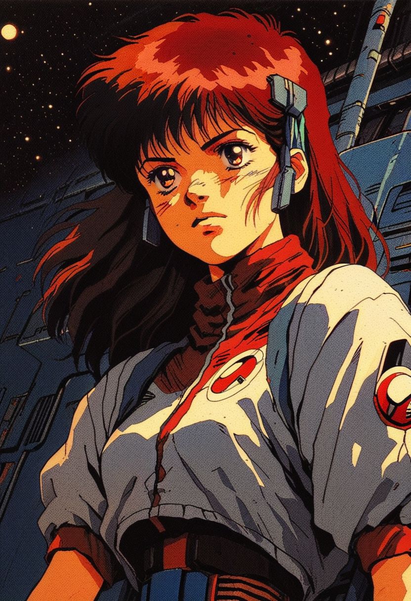score_9, knva, halftone effect, 1girl, solo, sci-fi, retro artstyle, outer space, mecha anime, EPguTakayaNoriko,
