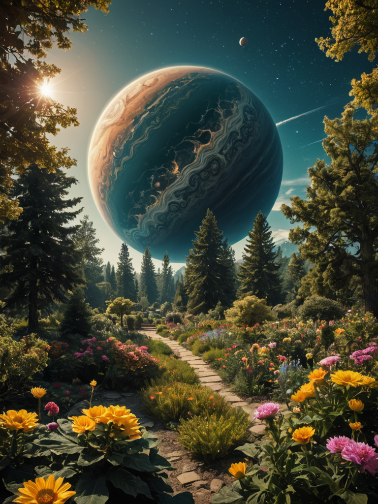 HDR, Fractal, Warm lighting, F/8, VRay, Kashmir, Crushing, Vintage, Dichromatic, Orientalism Art, CineColor, Light caustics, pinhole lens, Unity Engine, Proud, Grace, Kodak gold 200, F/14, Hopeless, Realism, broad lighting, Radiant ("Gouki Suprex":1.3) , dense garden and Planet Jupiter in background, Technicolor, surreal design, Haste, pixiv, Fujichrome Provia 100F
