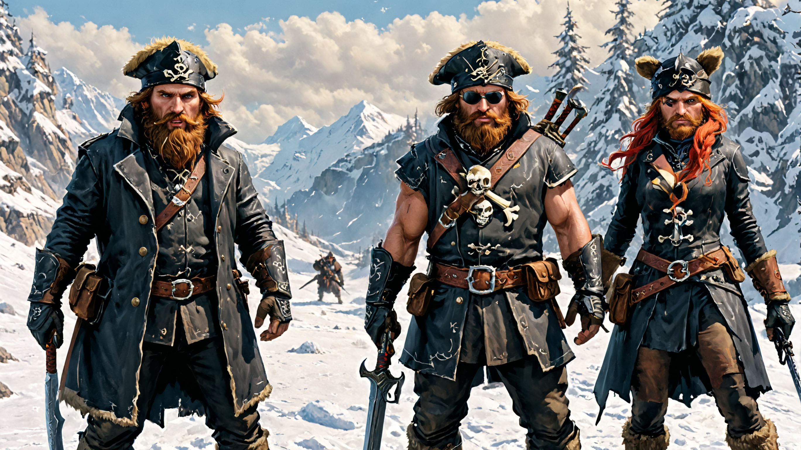 wideshot, In the frostbitten landscape of a rugged terrain, a burly Russian-looking man commands attention. His furry skull and crossbones hat, an eyepatch, and a face withered with battle-worn stubble speak of many winters survived. Beside him, two formidable women, equally rugged and undeniably curvaceous, stand ready. They are his unyielding companions, each holding a sausage like a weapon, their furry hats a testament to their resilience and unity in the face of the biting cold, in the style of the decaying empire of Würstreich, dark magic and grotesque creatures abound, inspired by Sean Aaberg's punk aesthetic, dark fantasy world combines grim landscapes with vibrant, exaggerated colorful art, heroes skirmish monstrous foes in a setting where rebellion, decay, and mysticism intertwine, crafting a unique, immersive vibe