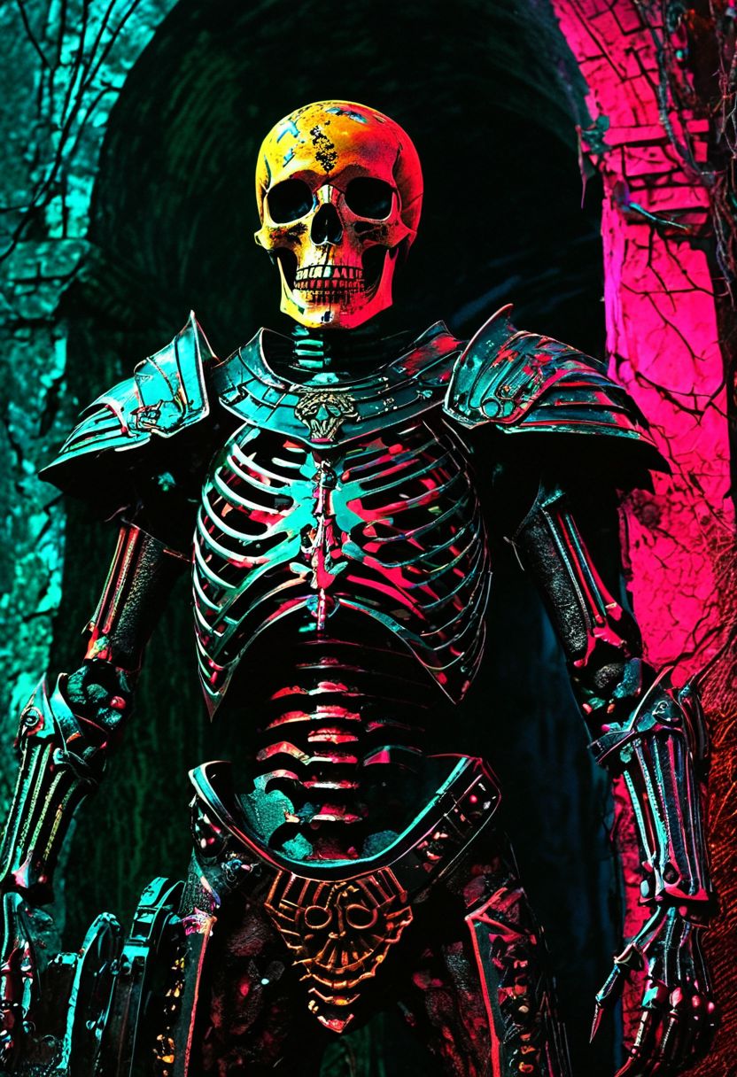 skeleton warrior with a cracked shield, guarding an ancient treasure in a forgotten tomb silhouette , in the style of the decaying empire of Wrstreich, dark magic and grotesque creatures abound, inspired by Sean Aaberg's punk aesthetic, dark fantasy world combines grim landscapes with vibrant, exaggerated neon colorful art, old 80's VHS dark fantasy, VHS screen grab, grainy, old footage
