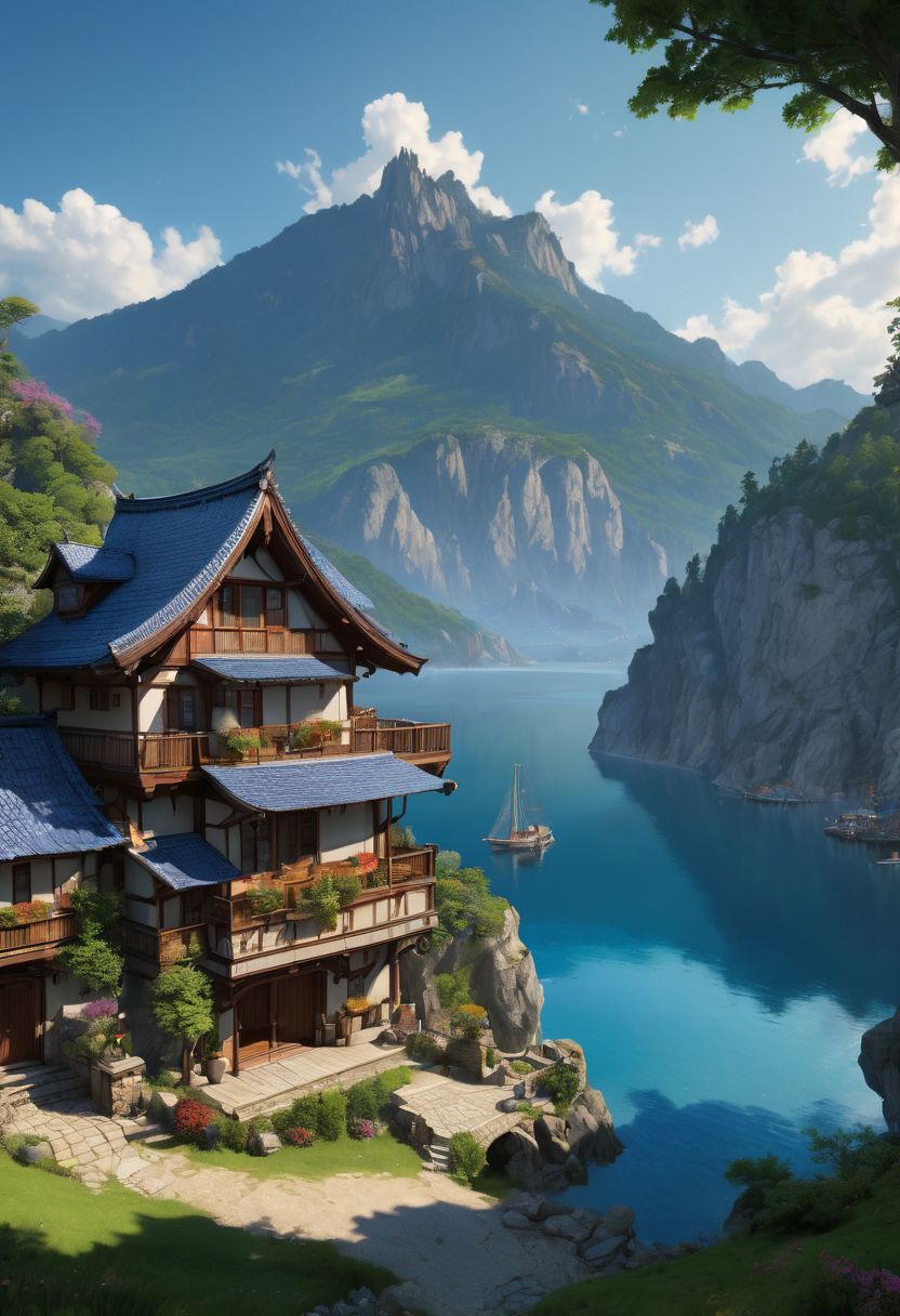 Masterpiece High quality HD perfection Sharp focus High resolution Reality captured Flawless execution Extremely detailed Fine lines Intricate contours Luminous realism Fine-tuned aesthetics Microscopic nuances Hyper-realistic textures Meticulous shading Sharp luminosity Unwavering finesse Perfection Epic clarity Whisper-soft gradients Immersive depth Precision-crafted lines Pure luminance, Masterpiece, best quality, sharp focus, extremely detailed, 8K HD, UHD. A landscape in a distinct anime style, reminiscent of Hayao Miyazaki a family sitting on a blanket on a beach with a view of the lake and mountains in the background, Hayao Miyazaki, official art, a detailed matte painting,
