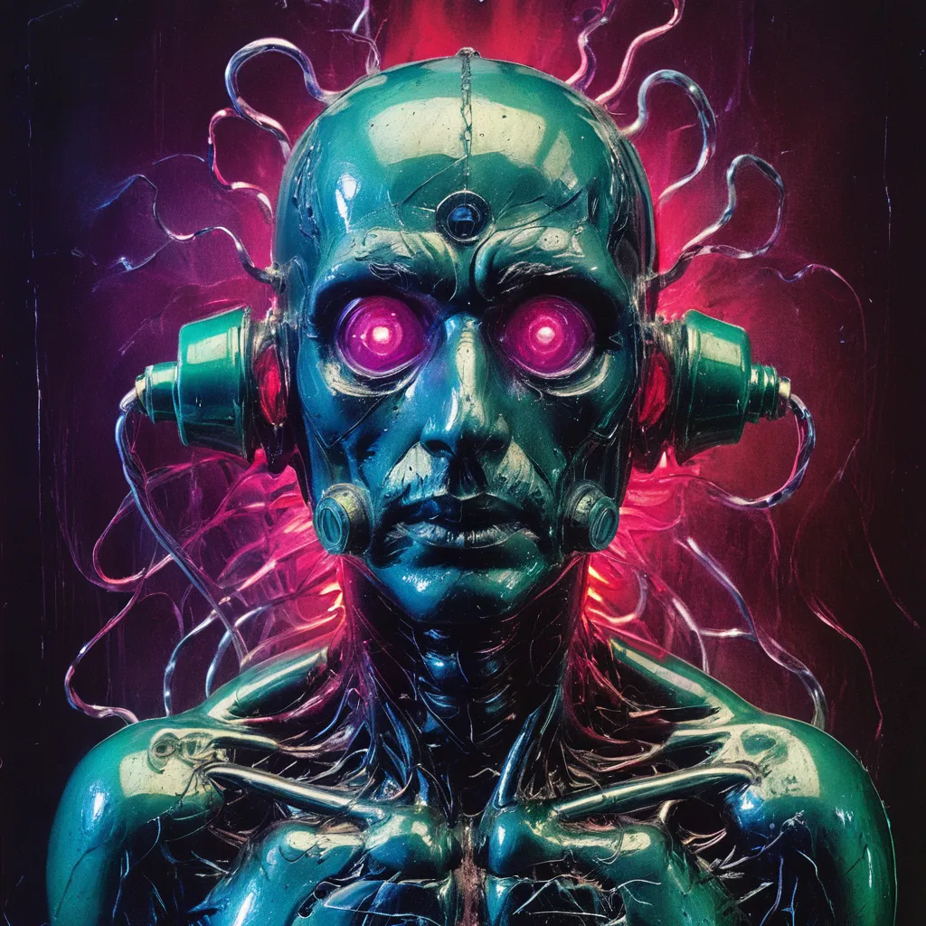 Vintage Toy Raygun, vintage street photo, blubber organism, smoldering skin, glossy circuit board cellular frame, electrified maggot limbs, vacuum tube amp wires, twisted neck, oozing pulsating matter, spewing larva vomit from large bubbles, translucent mask sack with veins showing multi colored nervous system, neon glow background, insanely detailed, art by Fantomas <lora:Vintage_Toy_Raygun:1.3> <lora:iris-xl:1> <lora:Vintage_Street_Photo:0.35> <lora:Dark_Novel:0.5>