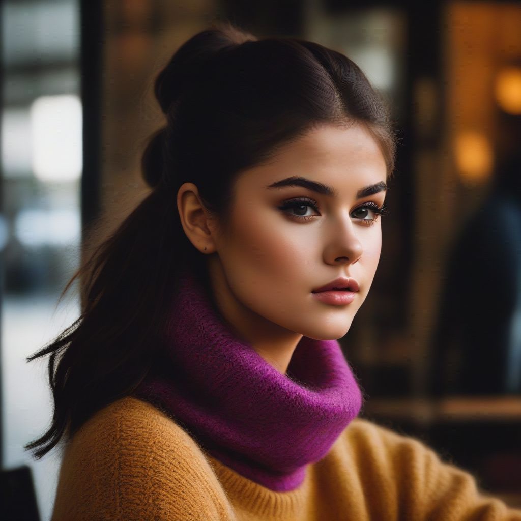 A skeuomorphic portrait of Selena Gomez (ohwx woman) <lora:SelenaGomez-000007:1> drinking coffee while trying to stay warm in a dimly lit coffee shop. She is wearing a thick and cosy mohair turtleneck sweater. Her makeup is colourful and vibrant. High definition, high quality, super high quality, best quality, perfect face, perfect hair, perfect clothing