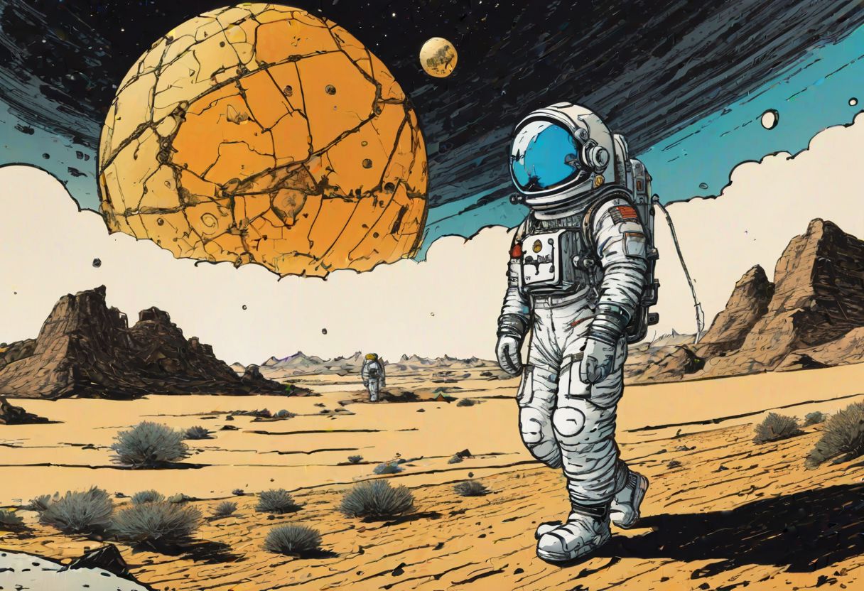 detailed pen and ink illustration of an astronaut on an extratereatrial desert planet, by Herge, in the style of tin-tin comics, vibrant colors, detailed, two astronauts, shrouded light, derelict spaceship, harsh Planet surface