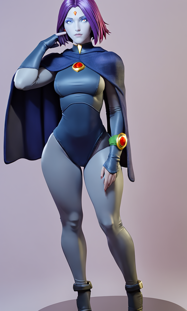 a woman wearing dark blue bodysuit with short cape , purple bob, raven from teen titans, grey skin, glowing eyes, <lora:esmsdxl:1>, esmsdxl, best quality, masterpiece, full body,