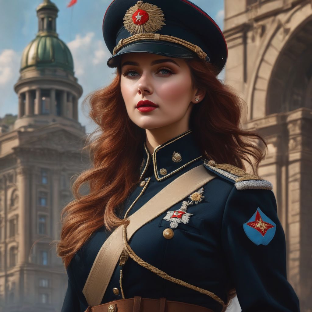 Artgerm, WLOP, Greg Rutkowski; Beautiful happy Soviet Soldier Girl in an Intricately Designed tight brown uniform, wavy red hair, Realistic nice blue eyes, big beautiful pupils, Standing resolute on the victorious battlefield of conquered Berlin, World War II, victory celebration, red flags and red carnations, Photograph Taken on Nikon D750, Intricate, (Attractive 21 years old girl: 1.5), Elegant, Digital Illustration, Scenic, Colourful colours, richly coloured composition, Hyper-Realistic, Hyper-Detailed, Unreal Engine, Cinematic Lighting, CryEngine, Octane Render, 8k, (Beautiful Soviet Soldier Girl: 1.2), Intricately Designed Handsome face, watercolor, Cinematic Lighting, intricate, smooth, sharp focus, digital painting, Alfons Mucha, perfect full body, Sensual female curves, Attractive, Attractive bust girl