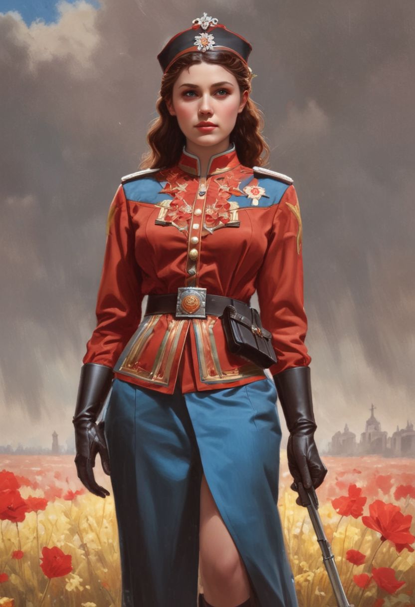 Artgerm, WLOP, Greg Rutkowski; Beautiful happy Soviet Soldier Girl in an Intricately Designed tight brown uniform, wavy red hair, Realistic nice blue eyes, big beautiful pupils, Standing resolute on the victorious battlefield of conquered Berlin, World War II, victory celebration, red flags and red carnations, Photograph Taken on Nikon D750, Intricate, (Attractive 21 years old girl: 1.5), Elegant, Digital Illustration, Scenic, Colourful colours, richly coloured composition, Hyper-Realistic, Hyper-Detailed, Unreal Engine, Cinematic Lighting, CryEngine, Octane Render, 8k, (Beautiful Soviet Soldier Girl: 1.2), Intricately Designed Handsome face, watercolor, Cinematic Lighting, intricate, smooth, sharp focus, digital painting, Alfons Mucha, perfect full body, Sensual female curves, Attractive, Attractive bust girl