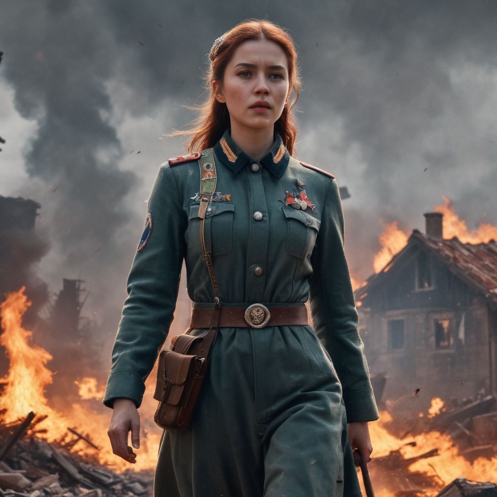 Hyperdetailed, hyperrealism, extremely high resolution of Beautiful Soviet Soldier Girl in WWII style, Intricately Designed Soviet dirty brown military winter uniform, ultra-realistic body, red army, realistic dirty face, bloody battle full of dirt and blood, fighting position, wavy red hair, Realistic blue eyes, big beautiful pupils, 8K, fire, dramatic war atmosphere, a stark scene from the heat of battle, NKVD, deep color, Cinematic Lighting intricate, smooth, sharp focus, digital painting, Photograph Taken on Nikon D750, Ruan Jia, Unreal Engine, CryEngine, Octane Render, red army style, Atrractive 21 years old woman, attractive girl
