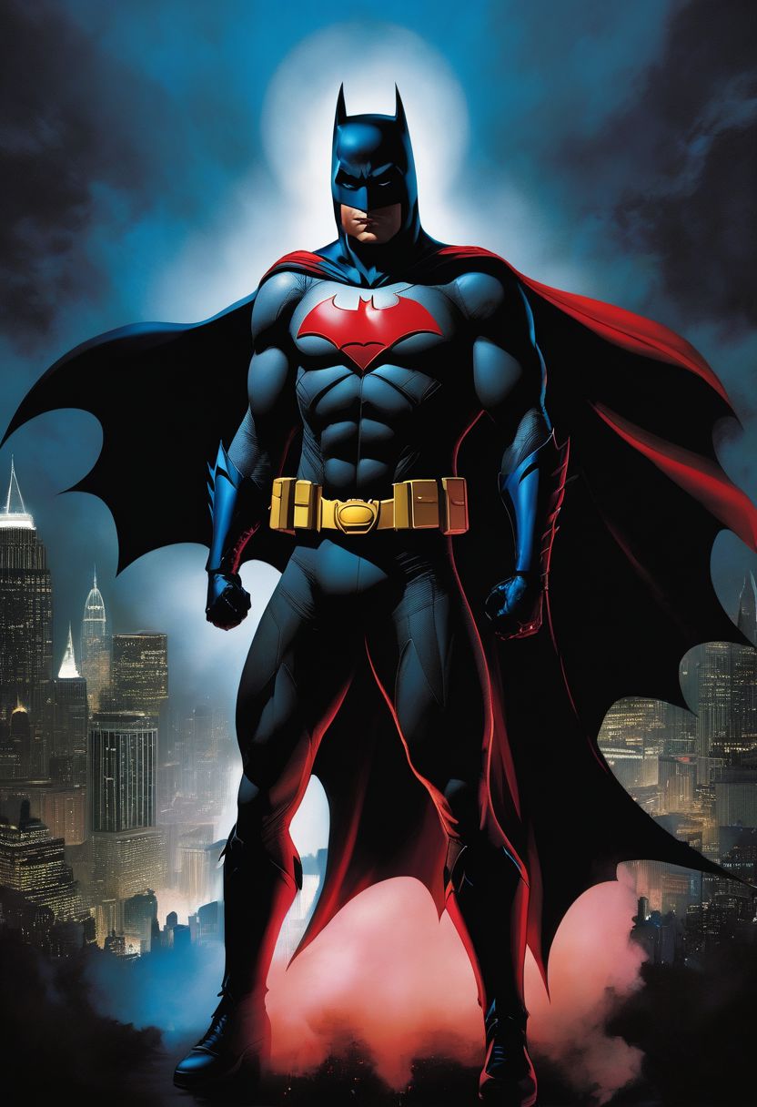 An interpretation of Batman and Supergirl in an romantic scene, their figures accentuated, holding a comfortable gaze full of affection, matte black Batman suit clashing with Supergirl's vibrant blue and red accents, striking contrast, Batman's hand tastefully hidden, Gotham city providing an atmospheric backdrop, under the veil of night sky, volumetric fog adding to mysterious aura, dramatic lighting highlighting their heightened emotions, ultra