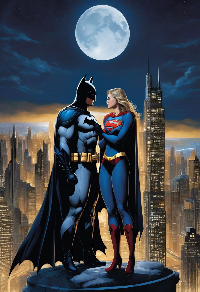 Transform a digital painting of a voluminous Batman and Supergirl in an intimate, close-knit embrace, their gazes locked in passionate adoration, set against a midnight cityscape background, spotlit by the crescent moon, their capes billowing in the cold breeze, displaying a surreal illustration of affection and admiration among towering Gotham skyscrapers, bathed in midnight blues and silvers, Batman, Supergirl, sed