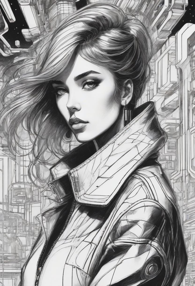 Maximalist pen art. Black and white. Ethereal. portrait. 1970s futuristic. 21 year old, beautiful model. Popped collar leather jacket, jeans.