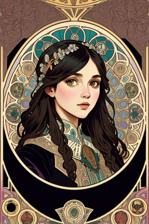 Alphonse Mucha inspired Art Nouveau portrait, black corvid, swirling floral and geometric backdrop, intricate linear embellishments, earthy and warm color palette, dramatic lighting, highly detailed illustration<lora:xl_more_art-full_v1:0.3>