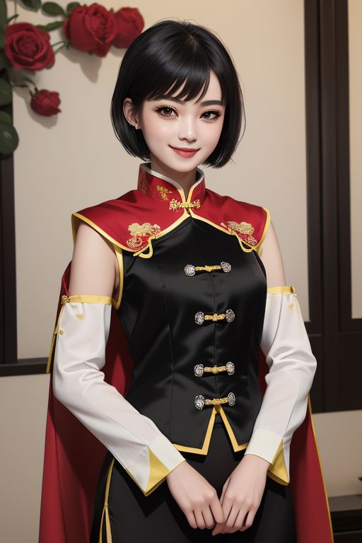 (masterpiece,best quality:1.5), __smt/Extremely beautiful clothes__, (black waistcoat, ancient china style, white sleeves, yellow edges, yellow decrorations, black collar, red cape on one shoulder, red rose decoration under collar, wide waistband), (1girl, female general, black hair, black eyes, slim and tall, smile), short hair