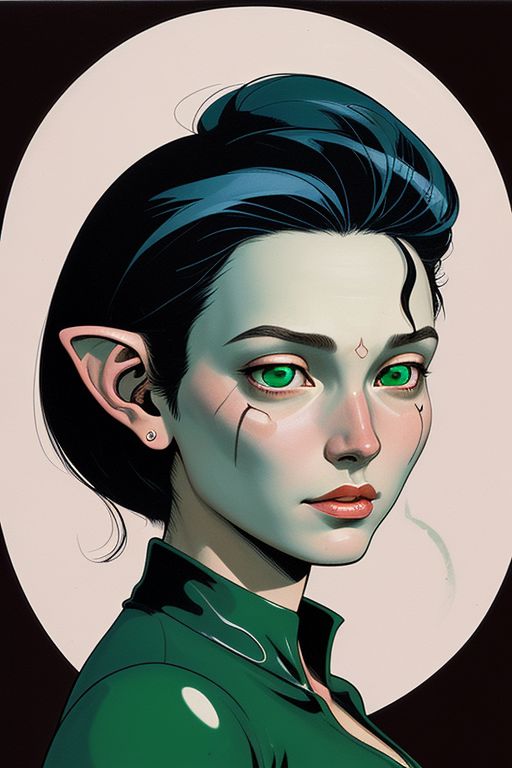 A Spanish fairy rogue with Bright emerald eyes, Blue-Black hair, Fair skin, delicate features, high cheekbones, pointed ears, Narrow face, Narrow face, Round face and Facial scar, art by Milo Manara and Mike Mignola