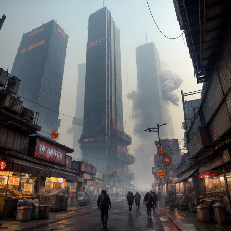 masterpiece,realistic,high quality texture,intricate details,detailed texture,super detailed cyberpunk city scene set in a dystopian future where towering skyscrapers pierce the smog-filled sky,neon signs,where steam rises from grates in the pavement and the air is thick with the scent of fried street food and industrial pollutants,megacorporation headquarters loom like monolithic fortresses,<lora:add_detail:1>,