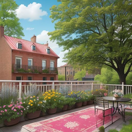 spring house,blue,yellow,red,white,pink,sky,water,flower,light,window,soil,fire,frat,tree,grass,brick,flatland,garden,pool,spring,clear,chair,,bed,room,glass,new,rooftop handrail,flat rooftop, veranda,fantasy, magic, novelty,cloud,vivid.wide,simple,rug,noon,gold,gem