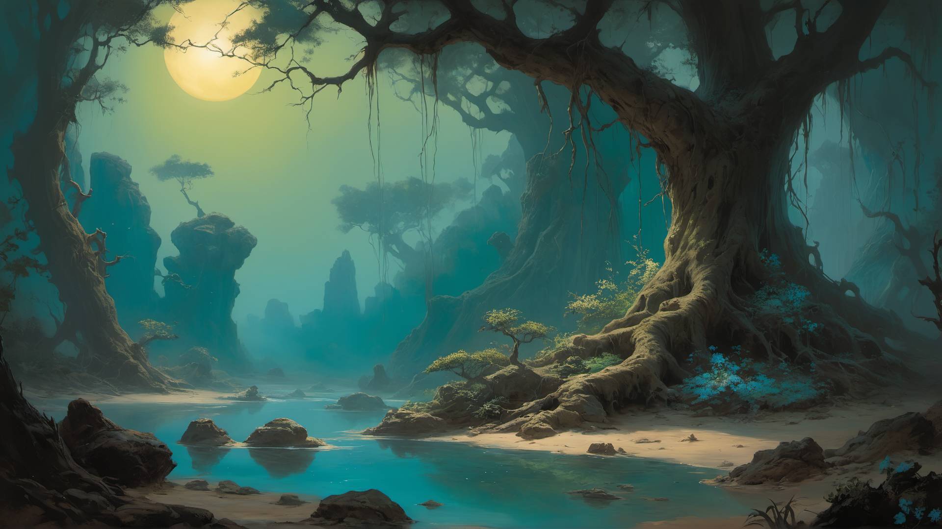 famous artwork by (chuck lukacs:1.1) and (frank frazetta:1.3) and (artgerm:1.4) and (jae cheol park \(valentina kallias\):1.3), detailed expressive eyes, fantasy style, the mysterious soulless swampgrabber, a karvyturbled monster ermerging from the depths of the misty slormspiggled swamps of planet monklurk ii, shown here with its flurbguzzled tentacles glistening in the moonlight as it zorgbaffles, twisting trees and prodimanting the will-o'-the-wisps in its vicinity., (Oil painting) (by Jean-François Millet), (by Gustave Courbet) , (by Jules Breton), close up, dark fantasy, <lora:add-detail-xl:2>, oil painting, traditional media, realistic, ,A breathtaking desert oasis landscape, where a massive and ancient megaflora thrives in the midst of barren sand and rocky terrain. The lush greenery of the megaflora serves as a stark contrast to the dusty ochre hues of the surrounding desert, creating a visual feast for the viewer. The massive trunks and towering branches of these unique trees stretch skyward, forming a canopy that provides welcome shade from the relentless sun. Delicate leaves and vibrant flowers adorn the trees, swaying gently in the warm breeze. A sparkling blue-green pool, fed by a bubbling natural spring, sits at the center of the oasis, surrounded by a carpet of lush vegetation.,