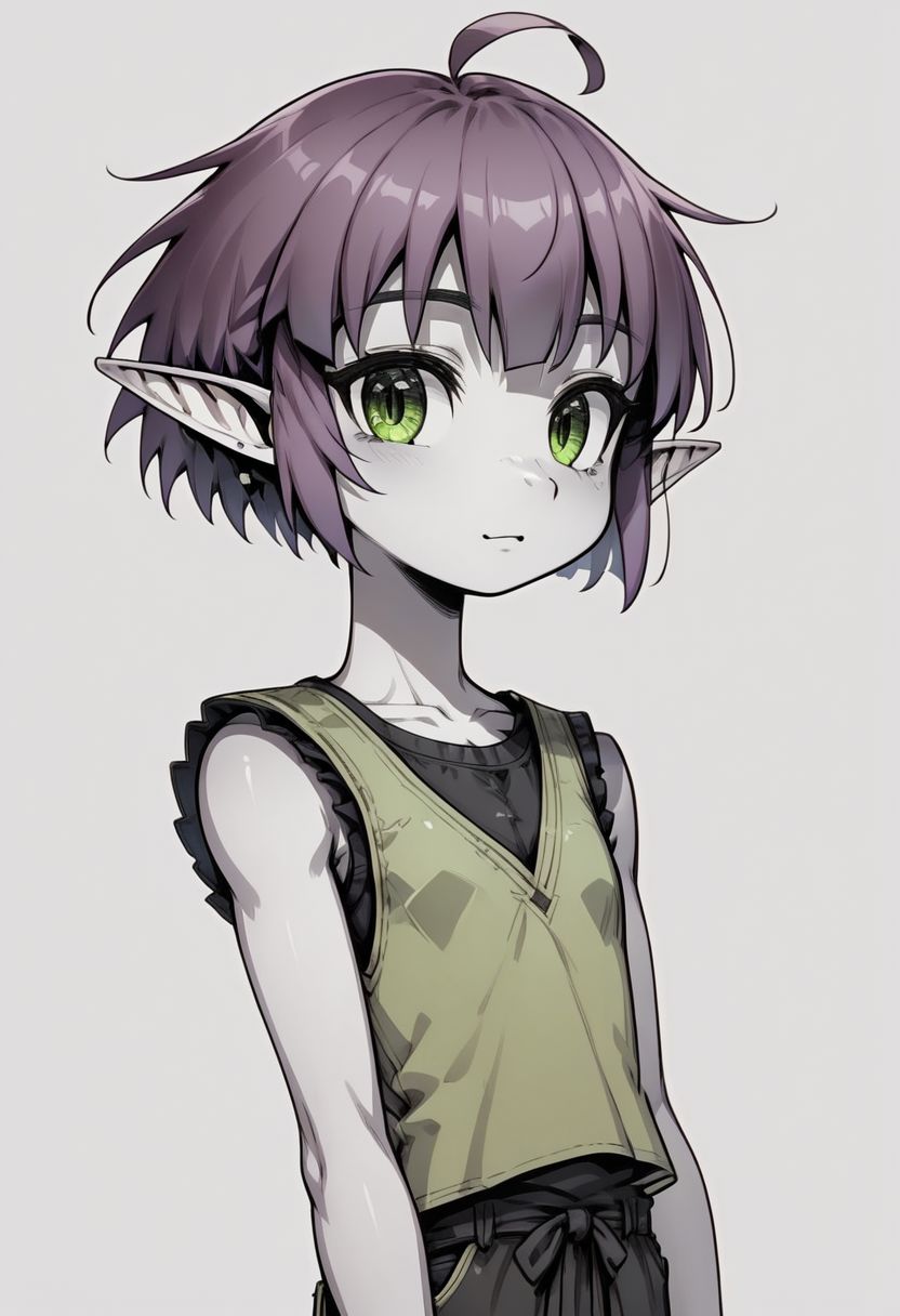 ASCIILapanya, 1 person, solo, pointy ears, ((snout nose)), flat chest, short stature, skinny arms, ((hazel irises)), fair skin, ((dark lilac hair)), short hair, tomboy haircut, small nostrils, 3 fingers 1 thumb ((Sleeveless green vest, fitted black undershirt, black pantaloons, fully clothed)), forest background, Lineart, clean lines, up close, upper body focus, highly detailed face, high quality, best quality, score: 9, score: 8 up, rating: safe