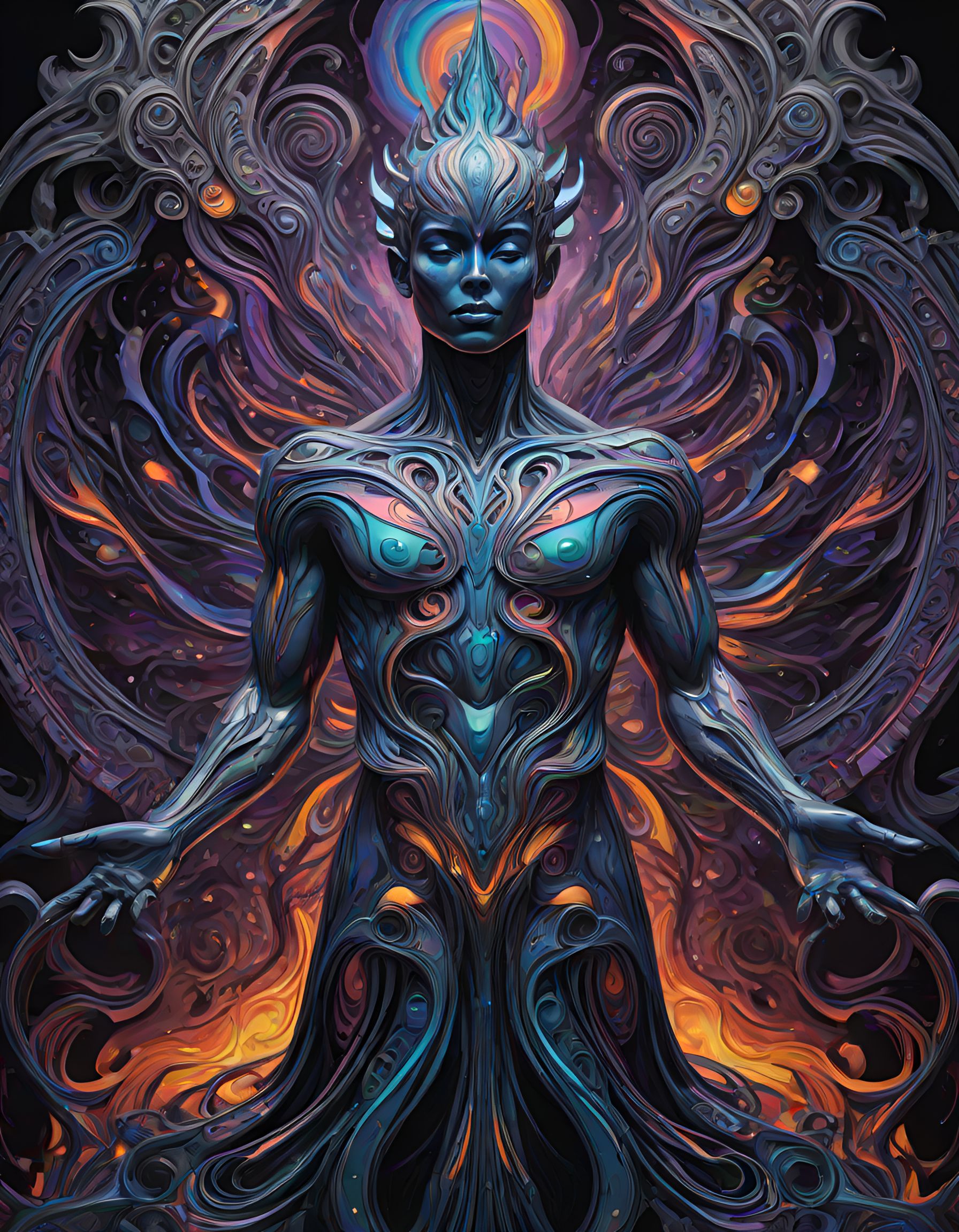 blacksmithing, Astral Aura, astral, colorful aura, vibrant energy,, Monochrome color guide, Installation Art,, Psychedelic style, Vibrant colors, swirling patterns, abstract forms, surreal, trippy,,bold, a debuffer, standing tall, hands on hips, looking confident, upper body,