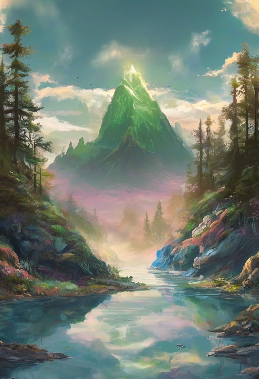 Split-view digital artwork of a rocky mountain lake in fantasy style. The top half shows a lush forest on earth the shore under a blue, cloudy sky, while the bottom half reveals an underwater scene with weird alien life forms that have been hiding out on the rocky bottom of the lake, aquatic plants, and fish. The image is in green, blue, and brown tones, illuminated by sunlight from the upper right corner. and weird alien glowing lights below the water.
